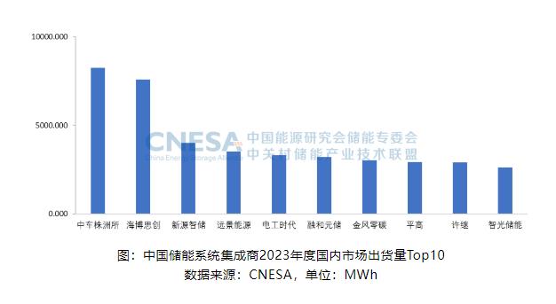 2023年,國內(nèi)市場中,儲能系統(tǒng)出貨量排名前十的中國企業(yè),依次為:中車株洲所、海博思創(chuàng)、新源智儲、遠(yuǎn)景能源、電工時代、融和元儲、金風(fēng)零碳、平高、許繼和智光儲能。