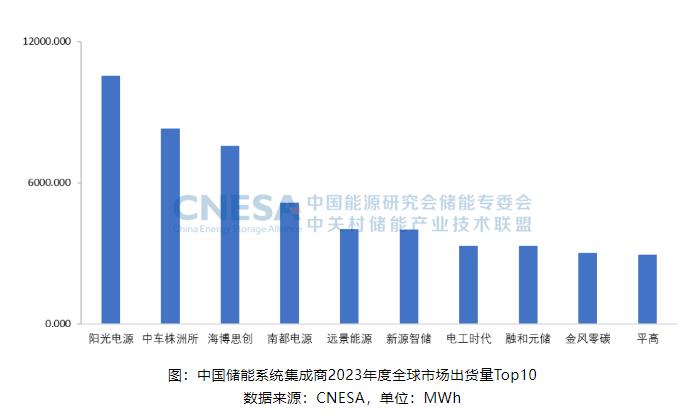 2023年,全球市場中,儲能系統(tǒng)出貨量排名前十的中國企業(yè),依次為:陽光電源、中車株洲所、海博思創(chuàng)、南都電源、遠(yuǎn)景能源、新源智儲、電工時代、融和元儲、金風(fēng)零碳和平高。