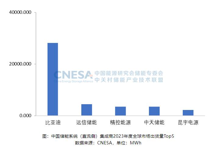 2023年,全球市場中,儲能系統(tǒng)(直流側(cè))出貨量排名前五位的中國企業(yè),依次為:比亞迪、遠(yuǎn)信儲能、精控能源、中天儲能和昆宇電源。